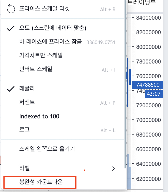 가격위치에서 마우스 우클릭후에 봉완성 카운트를 클릭하면 봉완성까지 시간을 카운트해줍니다.