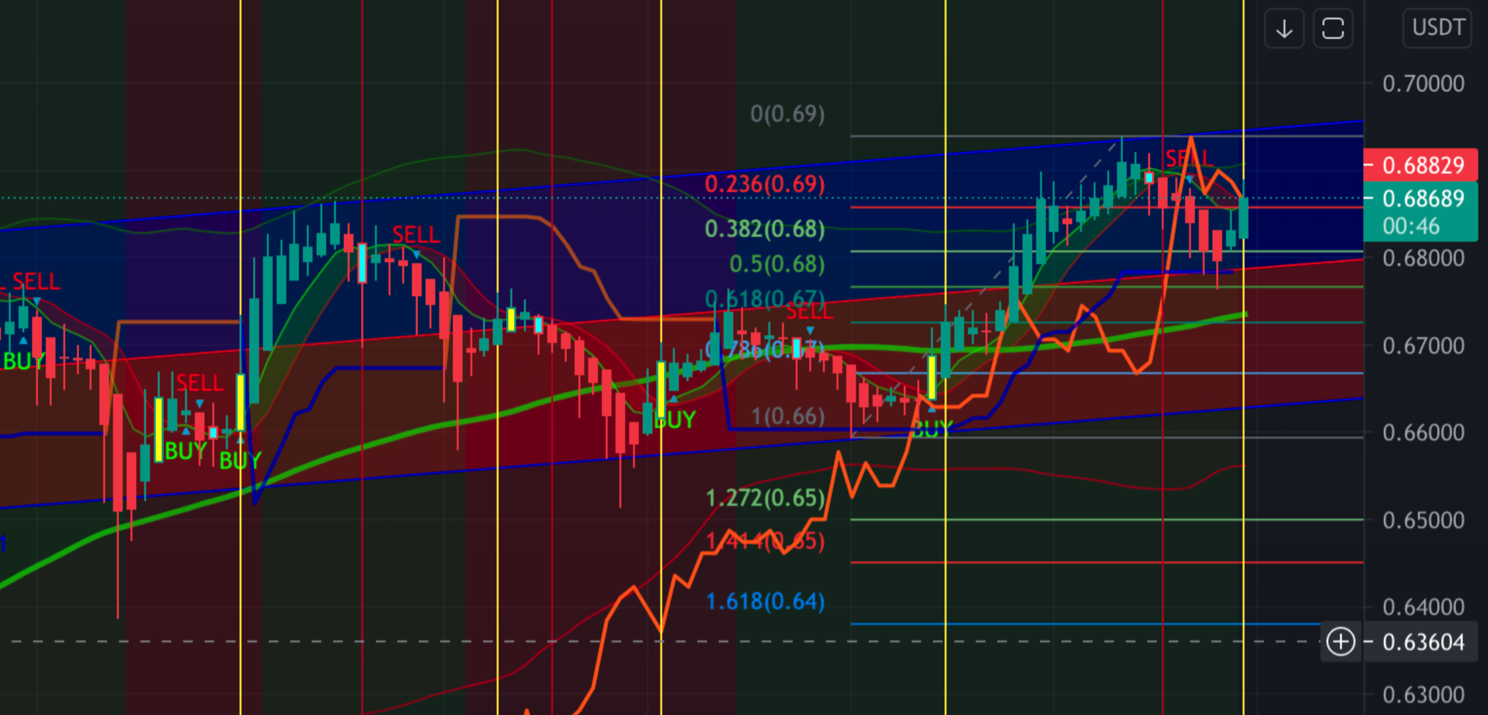 빨간 수직선은 매도점이고, 노란선은 매수점입니다.