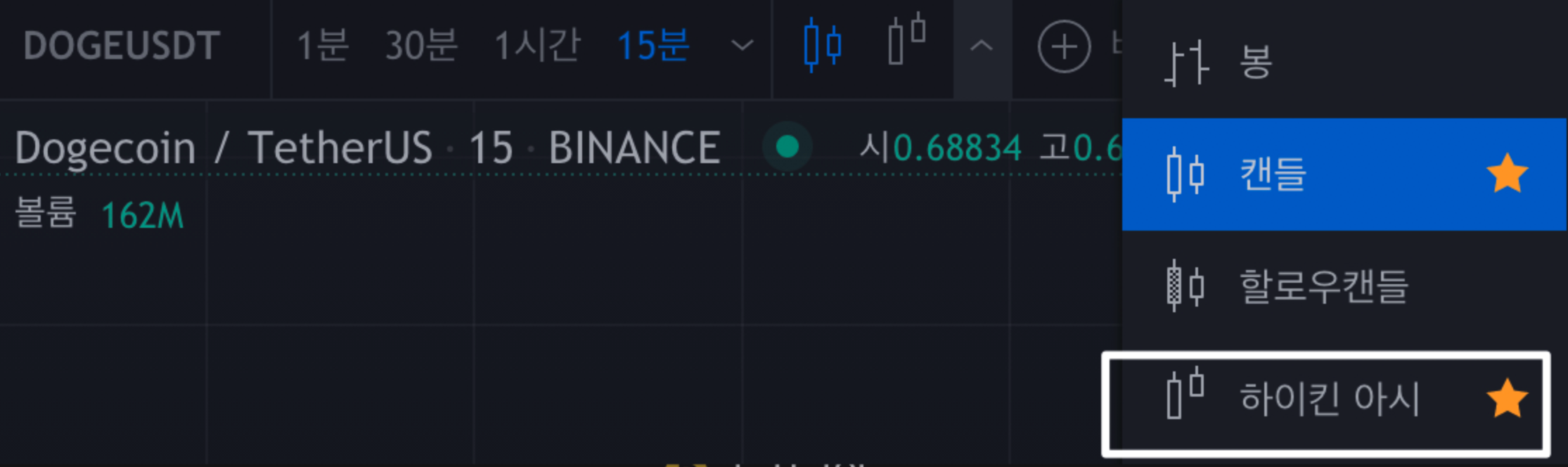 여기서 차트가나오면 하이킨아시를 켜줍니다.